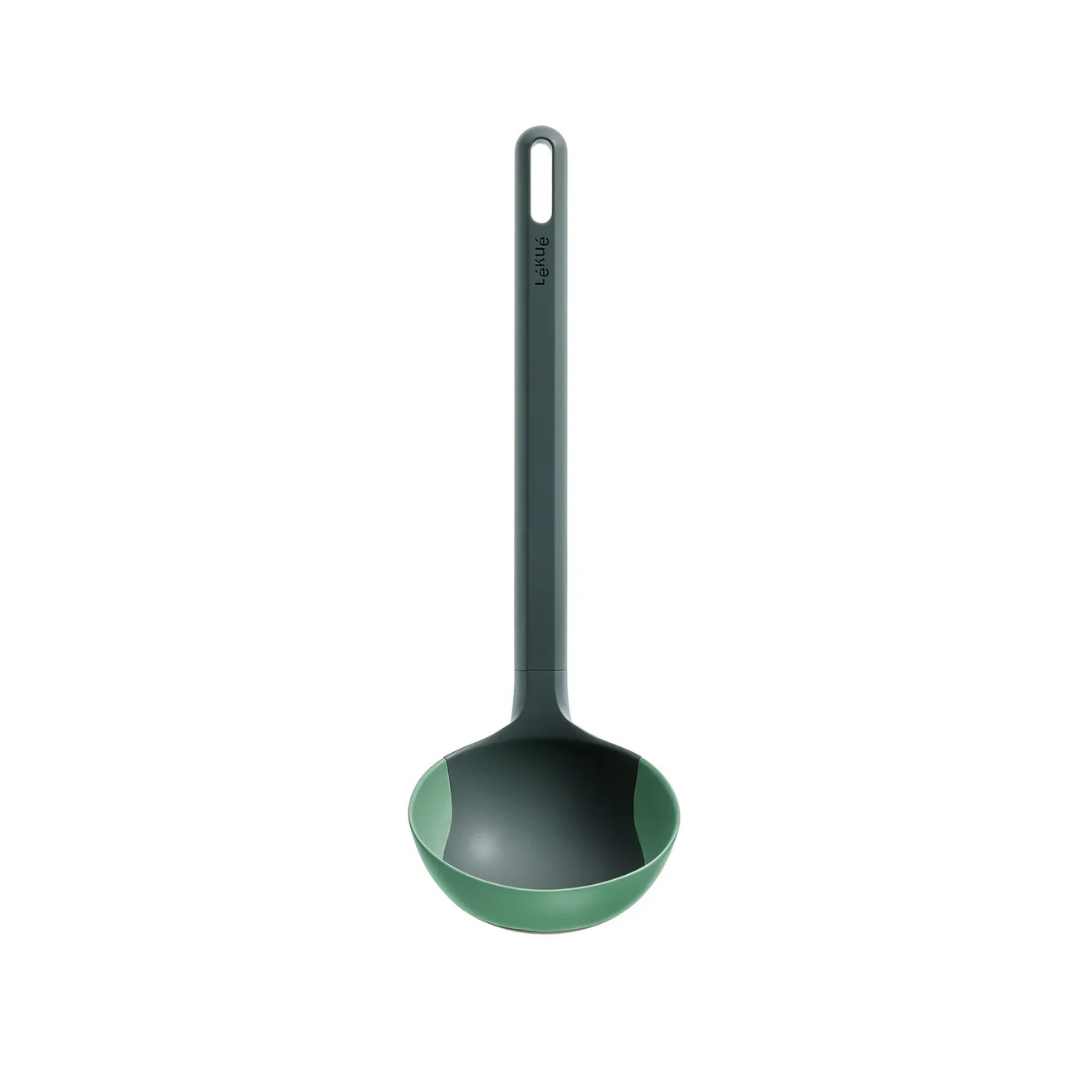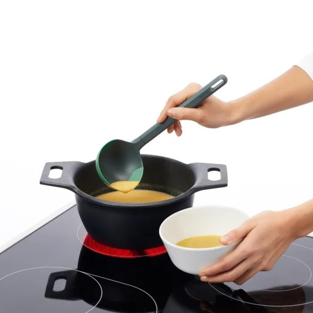 Kutlača od platinskog silikona i PBT plastike, otporna do 220°C. Fleksibilna, ne grebe posuđe i sigurna za hranu. Prikladna za perilicu posuđa.